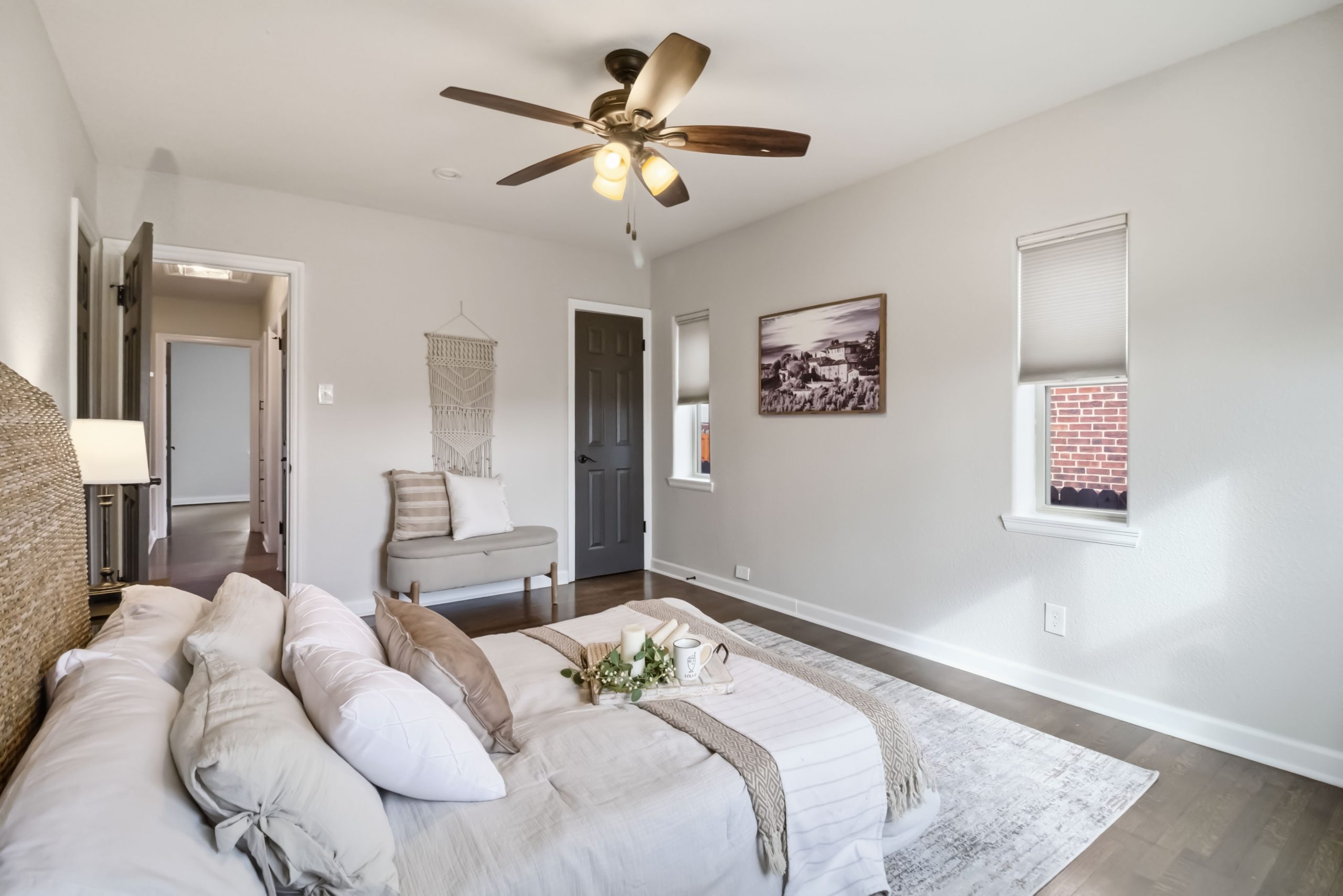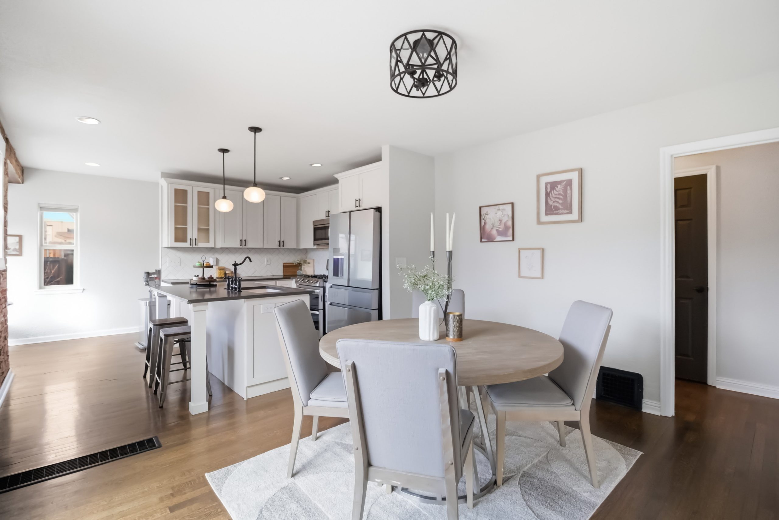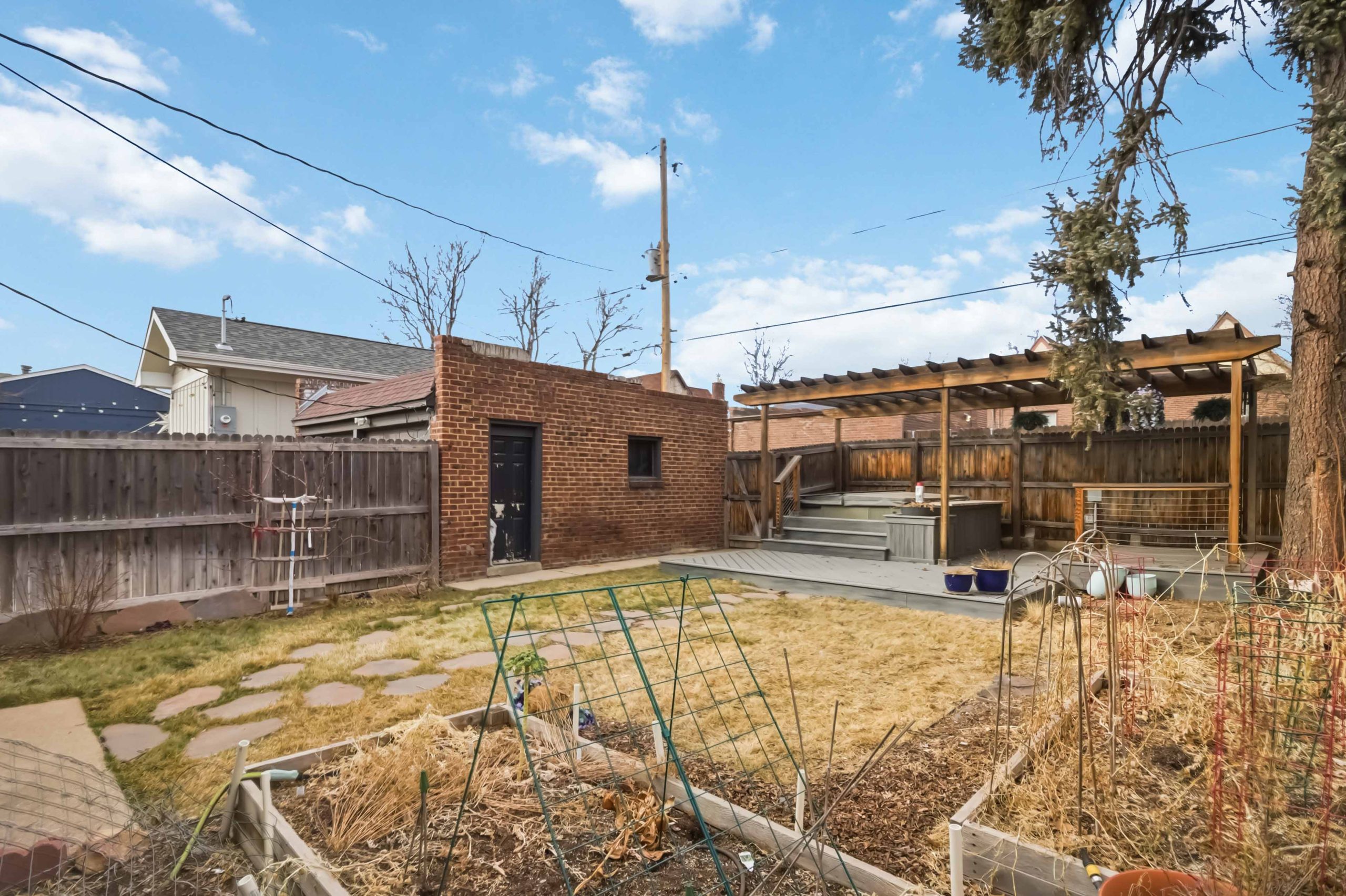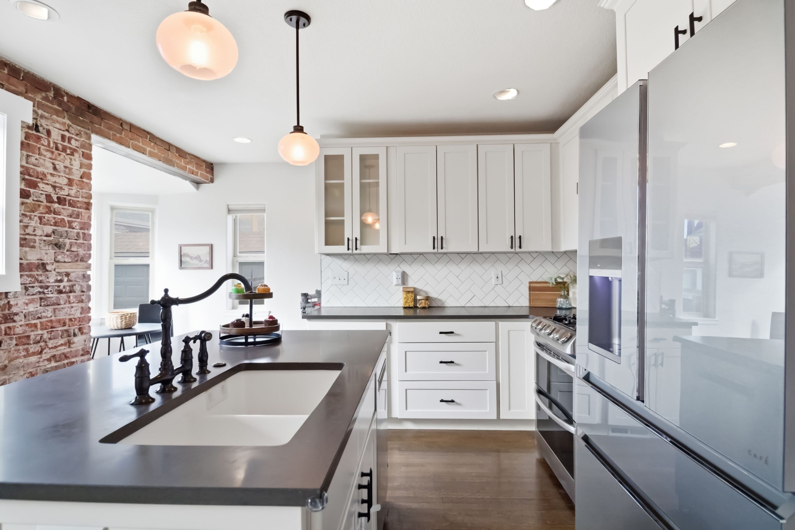 Classic Park Hill Tudor with the character intact and the updates already done. Arched doorways, crown molding, and hardwood floors set the tone on the main level, while a fully remodeled kitchen brings it into the present — white shaker cabinets, quartz counters, herringbone tile backsplash, stainless appliances, center island, and an exposed brick accent wall that earns every compliment. The adjacent dining room opens to the patio through a sliding glass door, and the living room anchors the front of the home with a gas fireplace. Two main floor bedrooms share a remodeled hall bath with double sinks; one bedroom includes a murphy bed, making it an instant guest room and office in one.