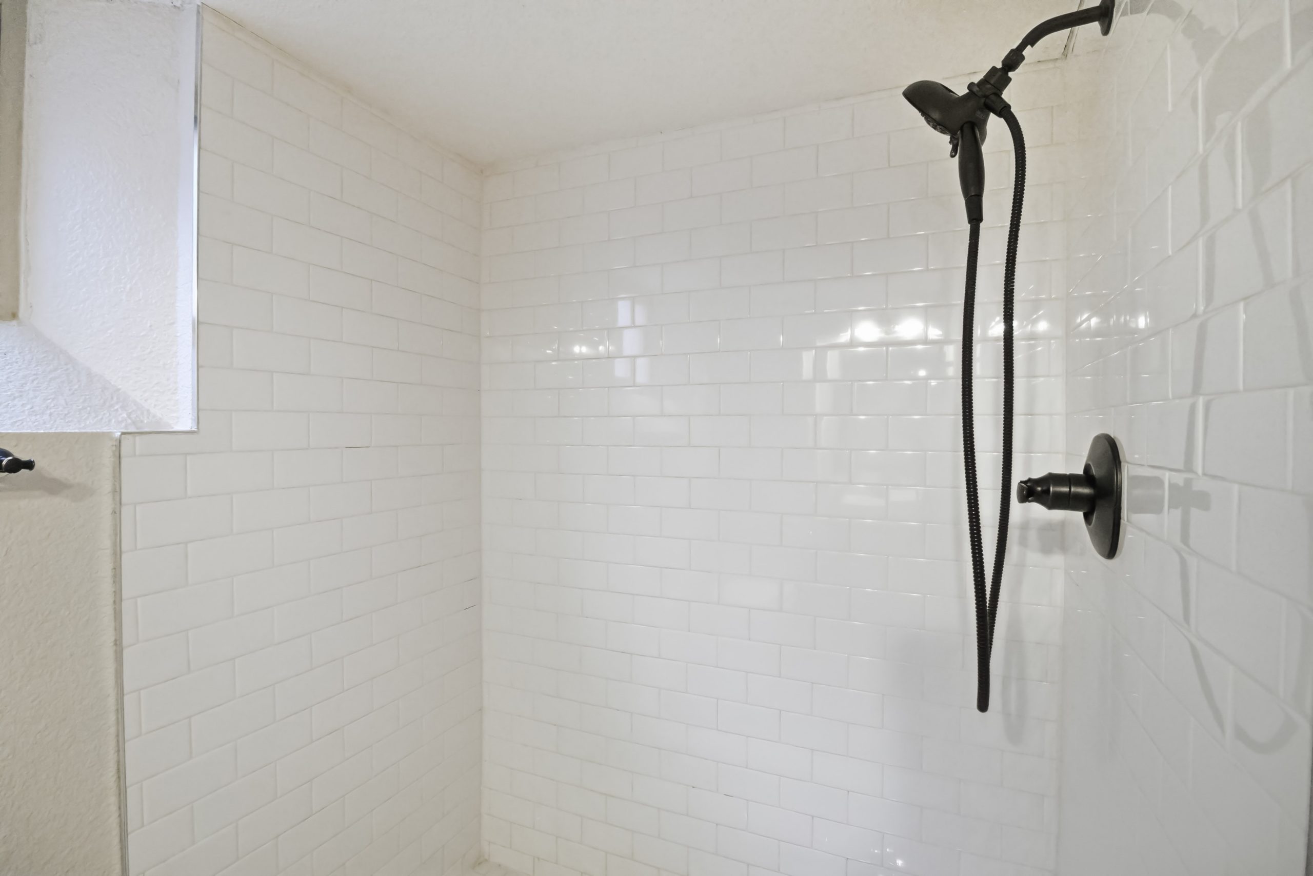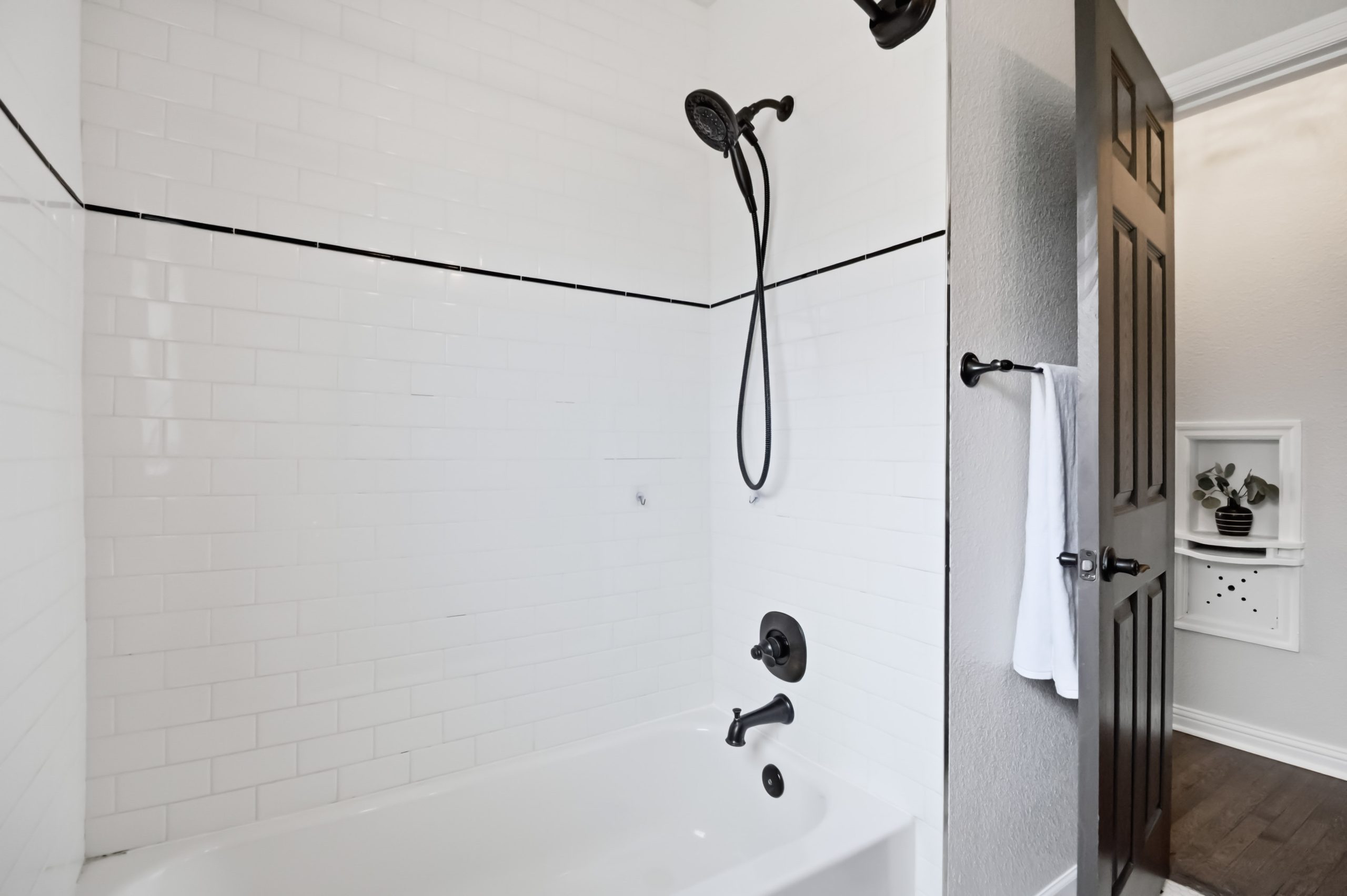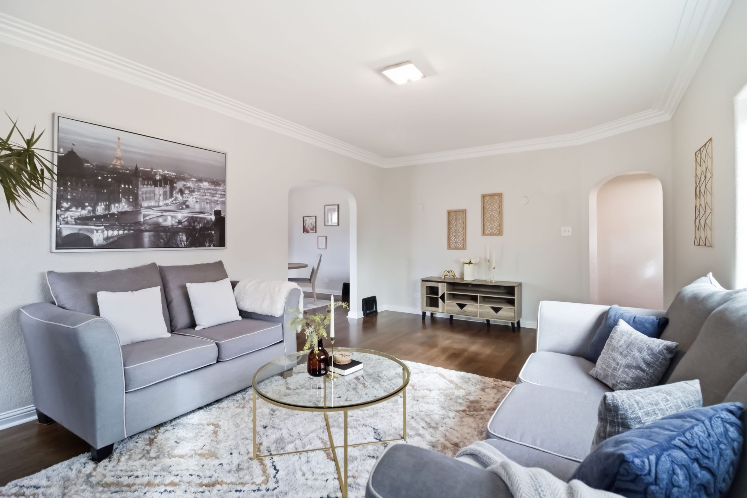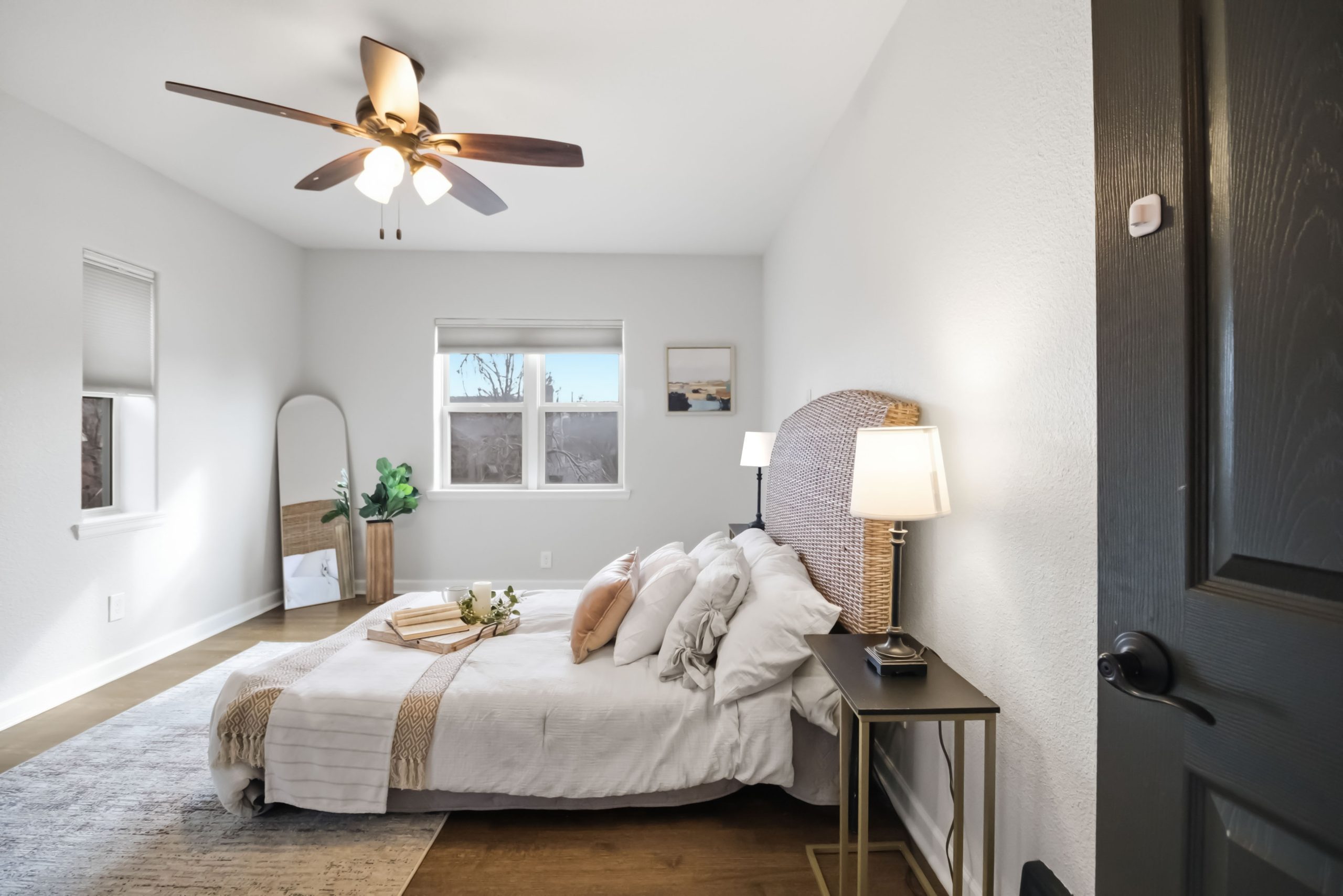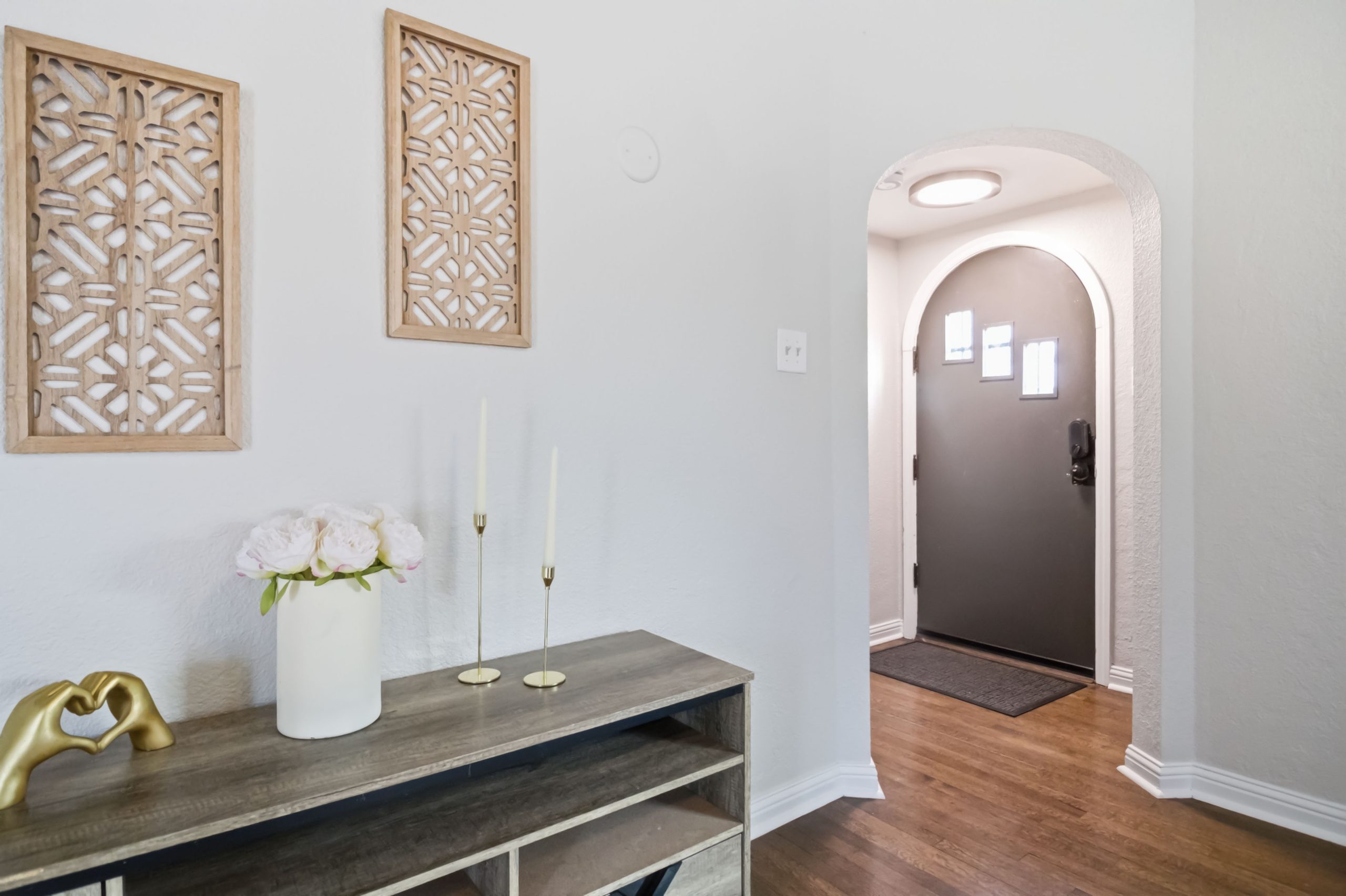 Classic Park Hill Tudor with the character intact and the updates already done. Arched doorways, crown molding, and hardwood floors set the tone on the main level, while a fully remodeled kitchen brings it into the present — white shaker cabinets, quartz counters, herringbone tile backsplash, stainless appliances, center island, and an exposed brick accent wall that earns every compliment. The adjacent dining room opens to the patio through a sliding glass door, and the living room anchors the front of the home with a gas fireplace. Two main floor bedrooms share a remodeled hall bath with double sinks; one bedroom includes a murphy bed, making it an instant guest room and office in one.