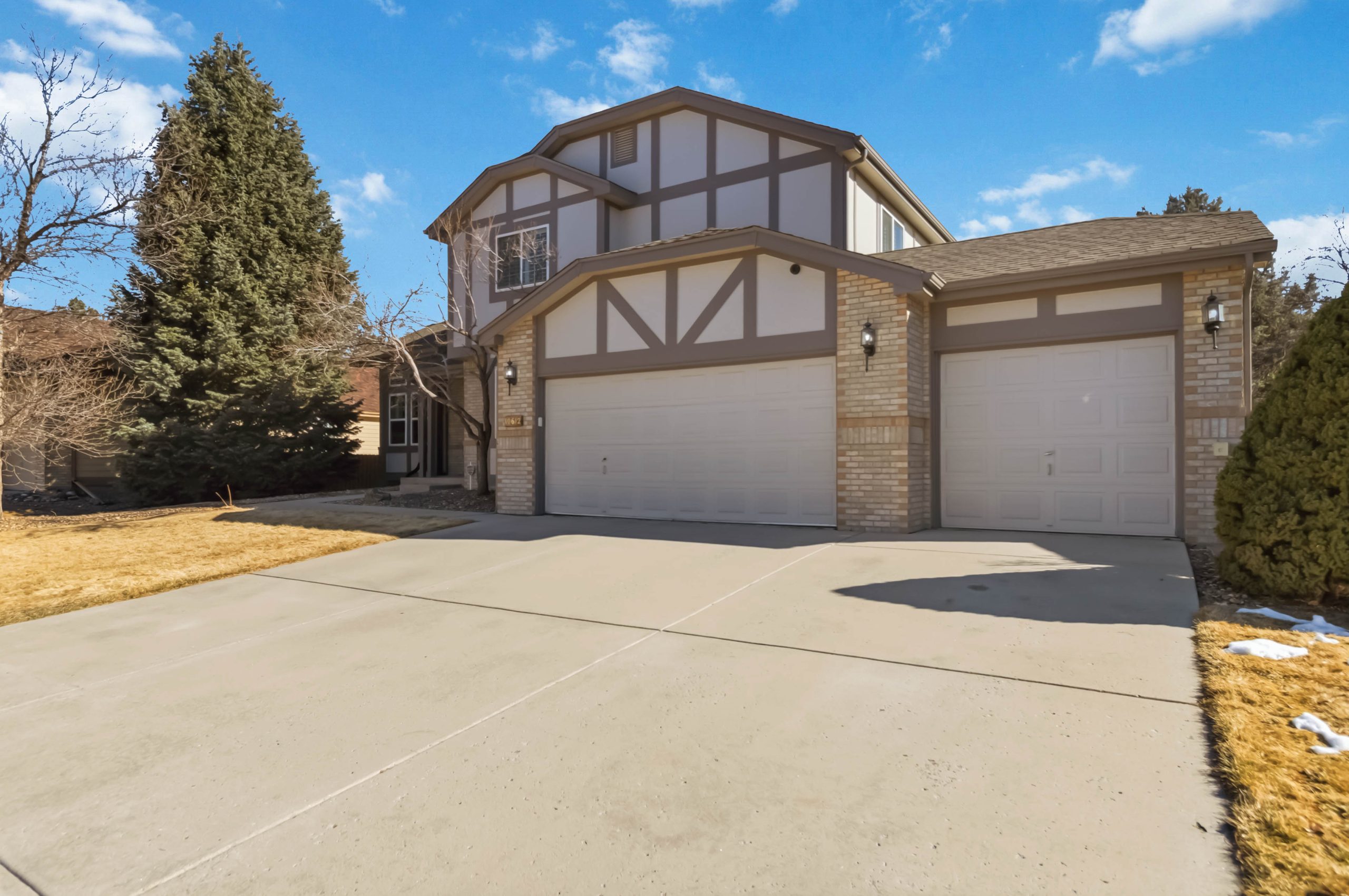 From the street, the Tudor-style architecture and fresh exterior paint make a strong first impression — brick accents, wood trim details, a three-car garage, and mature landscaping on a quiet Parker street. Inside, the home delivers on that promise with 3,634 finished square feet, five bedrooms across three levels, and a beautifully finished basement.