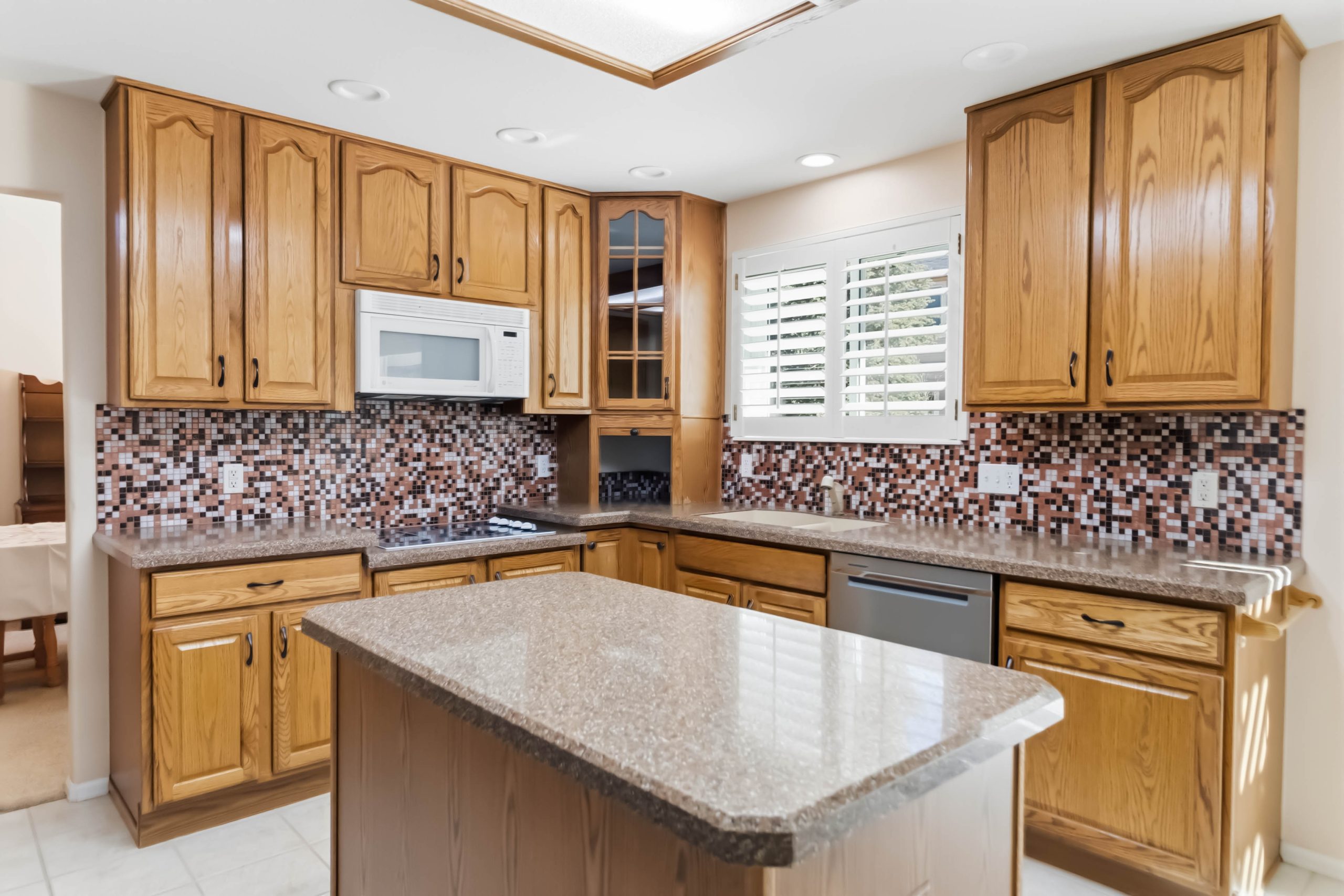 The main level is built for how people actually live. A formal living room with vaulted ceilings and a gas fireplace anchors one end. The kitchen — outfitted with a double wall oven, cooktop, center island, and Corian counters — opens to a breakfast nook and the family room, where a second gas fireplace keeps things comfortable all winter. The main level also has a bedroom that makes a great office and full bath, plus the laundry room, all on the same floor.