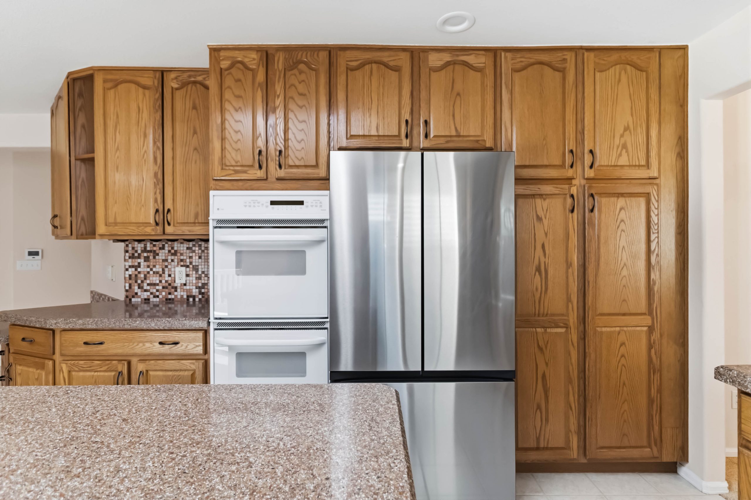 The practical details check out too: the roof is two years old, the exterior was just freshly painted, a radon mitigation system is installed, and every appliance is included — refrigerator, cooktop, double oven, microwave, dishwasher, washer, dryer, basement beverage refrigerator, and the garage refrigerator.