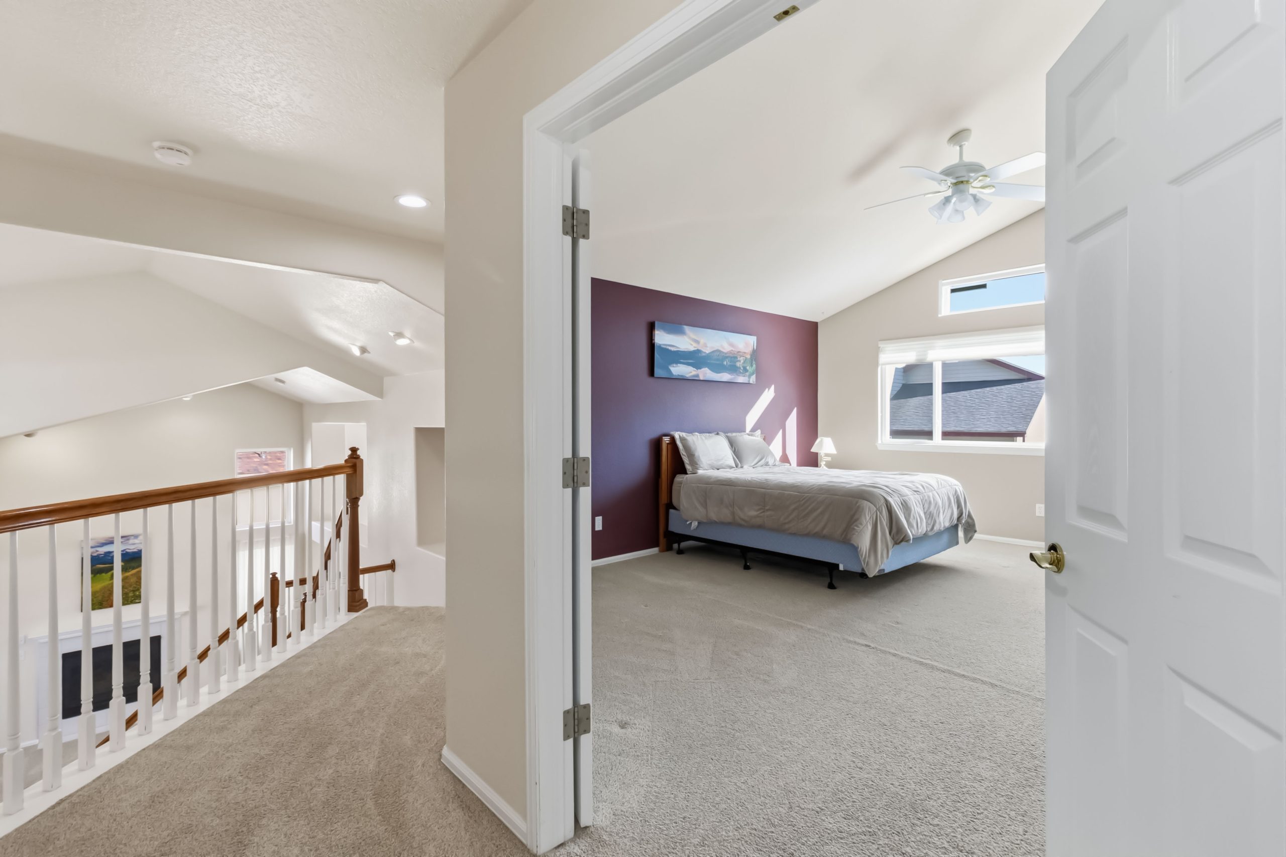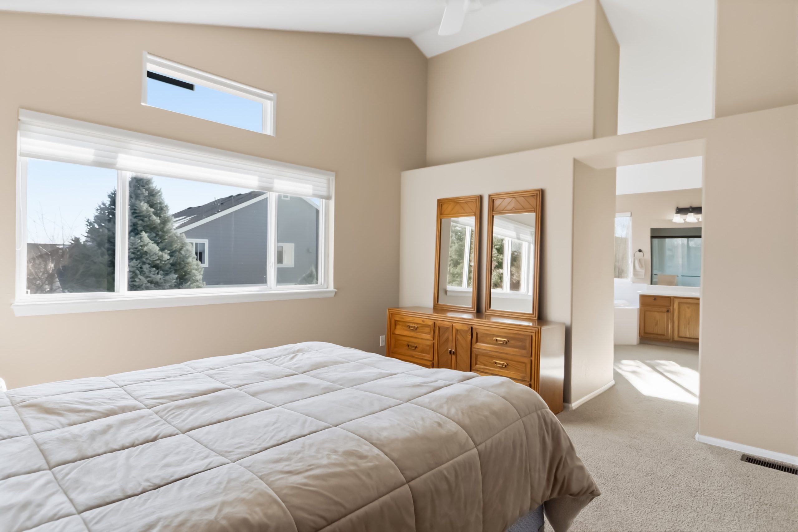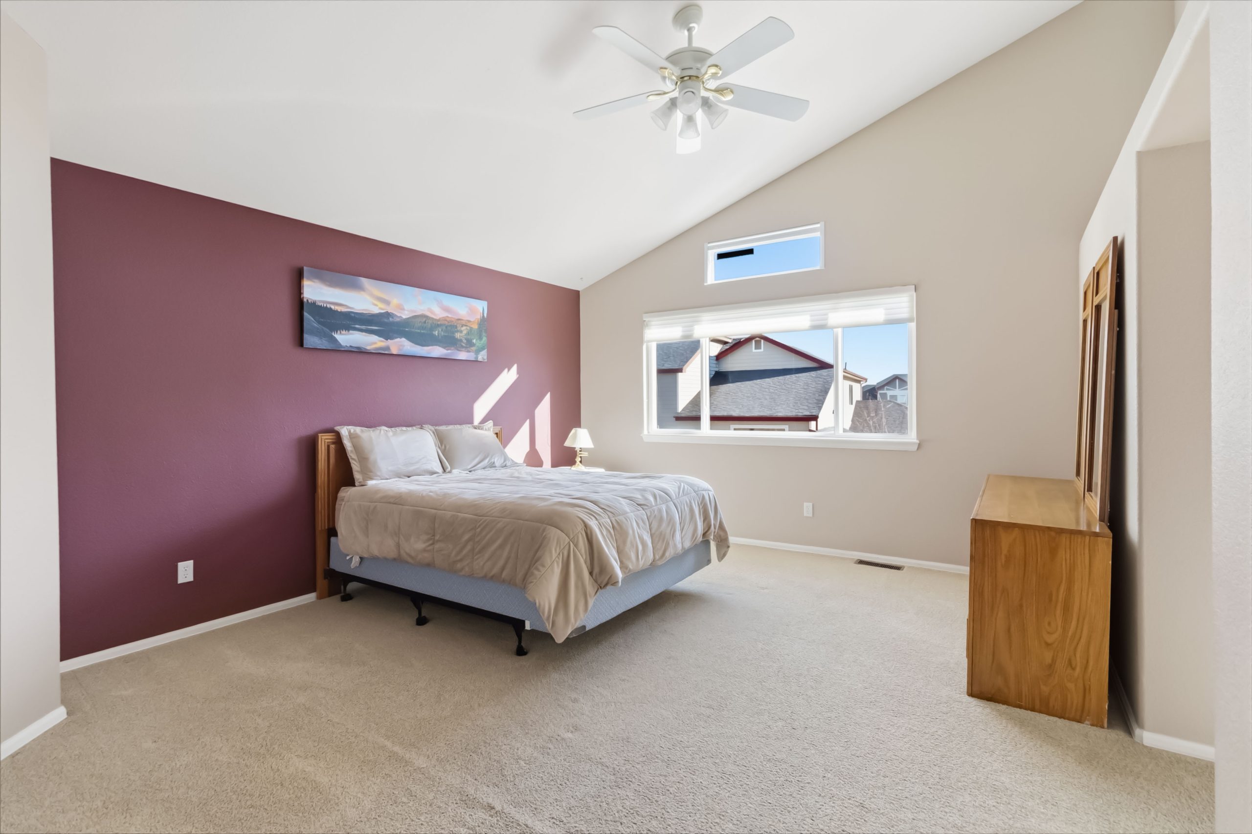 Upstairs, the primary suite has a vaulted ceiling, five-piece bath with soaking tub and separate shower, and a walk-in closet with plenty of room for two. There are two secondary bedrooms on this level that have their own walk-in closets, and the hall bath serves the upper level with double sinks and a skylight.