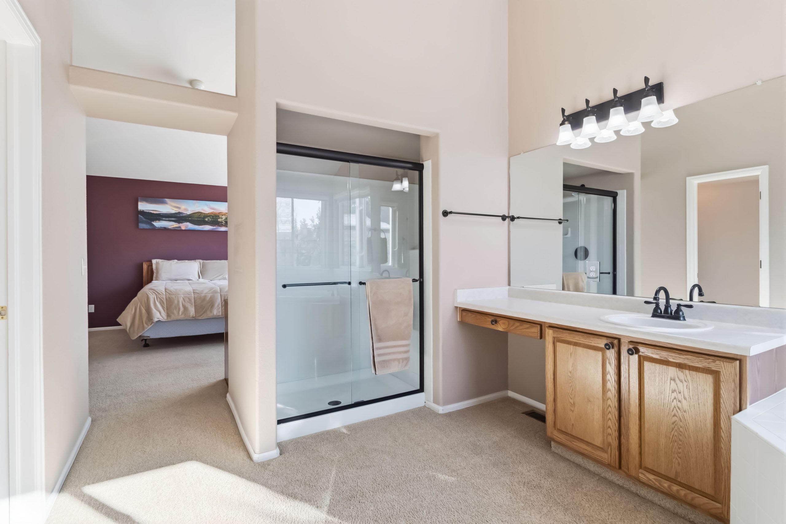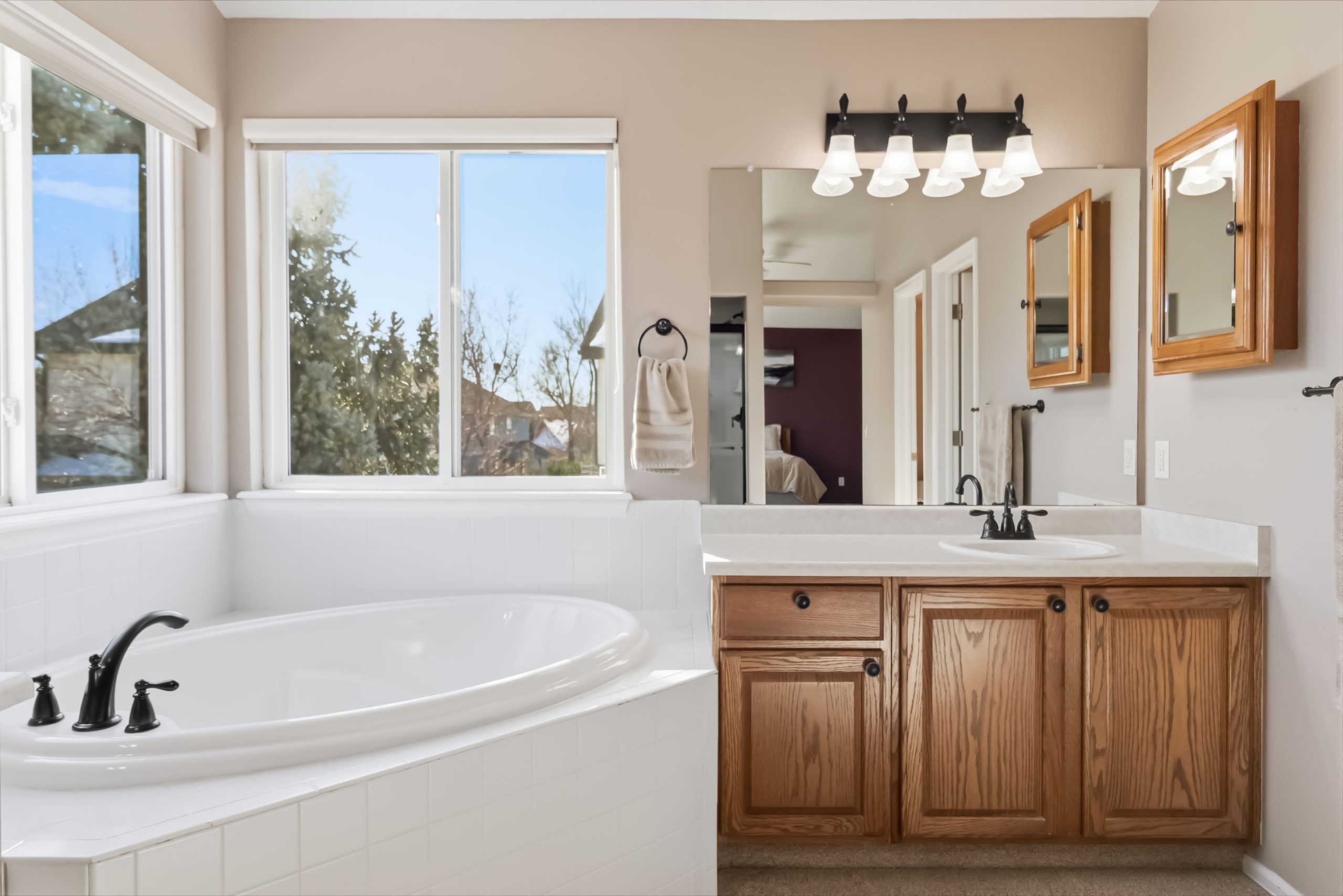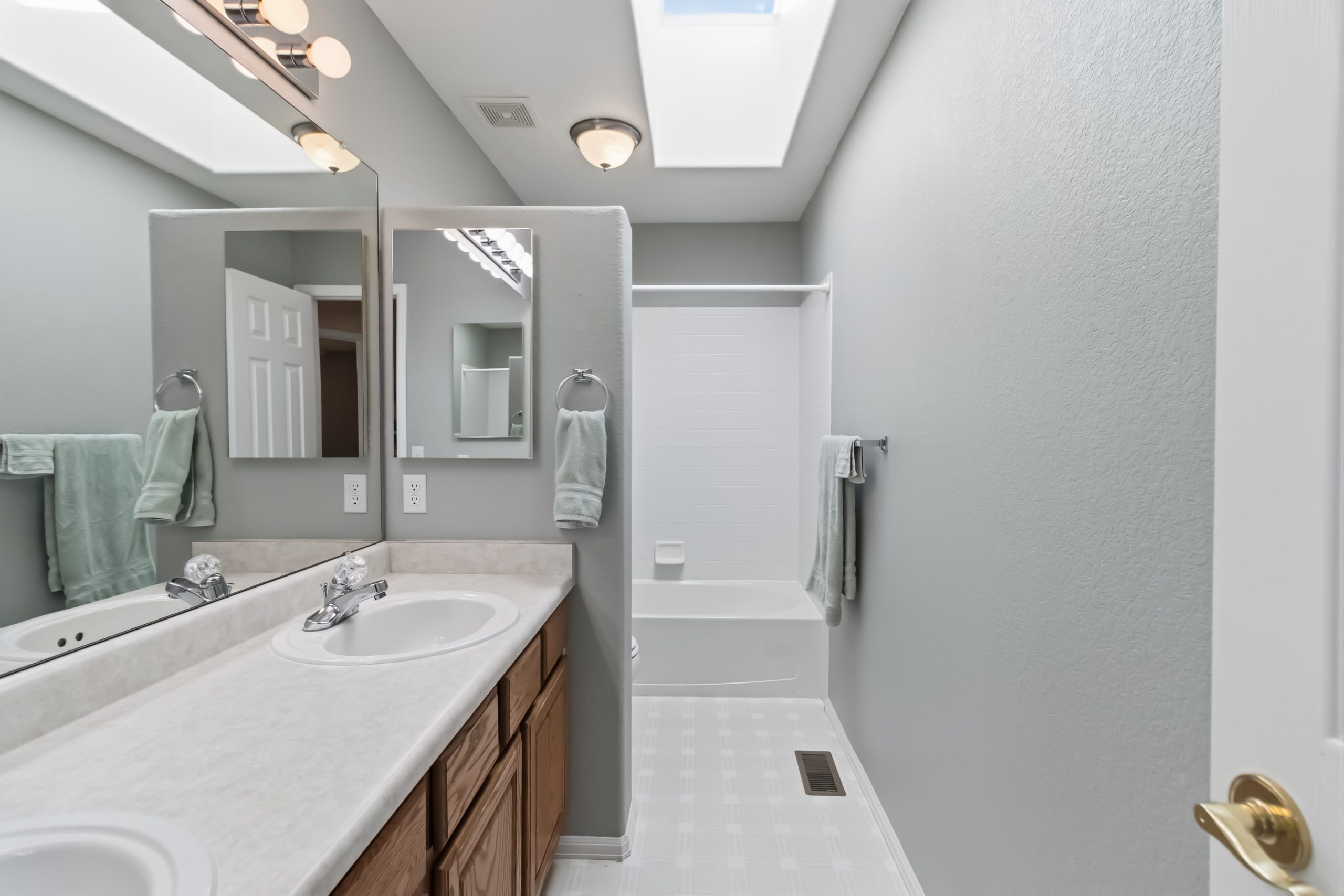 Upstairs, the primary suite has a vaulted ceiling, five-piece bath with soaking tub and separate shower, and a walk-in closet with plenty of room for two. There are two secondary bedrooms on this level that have their own walk-in closets, and the hall bath serves the upper level with double sinks and a skylight.