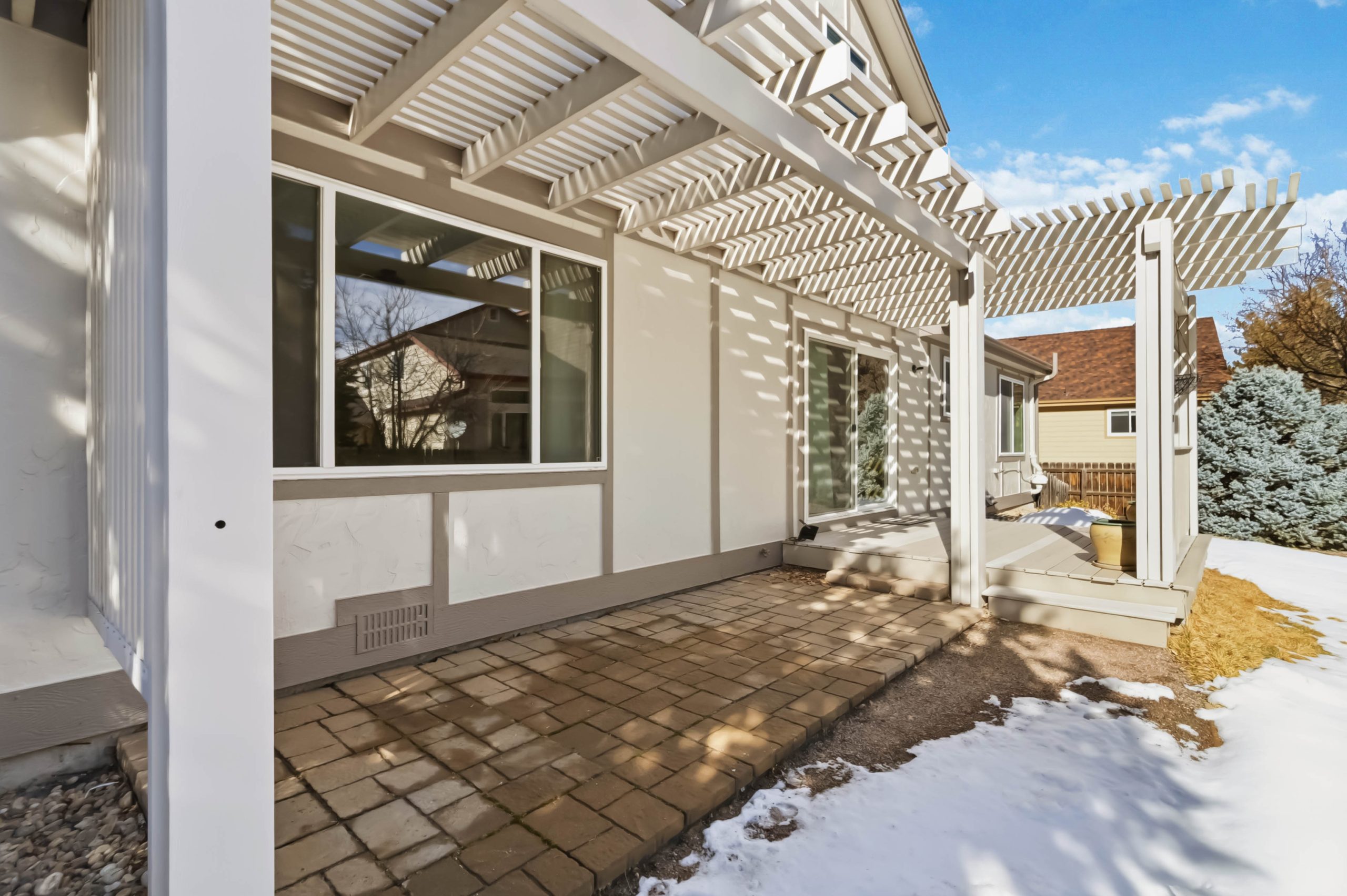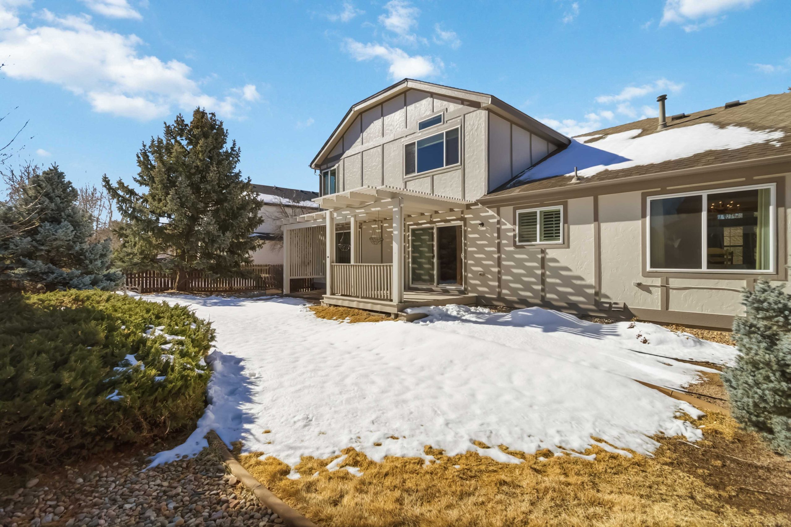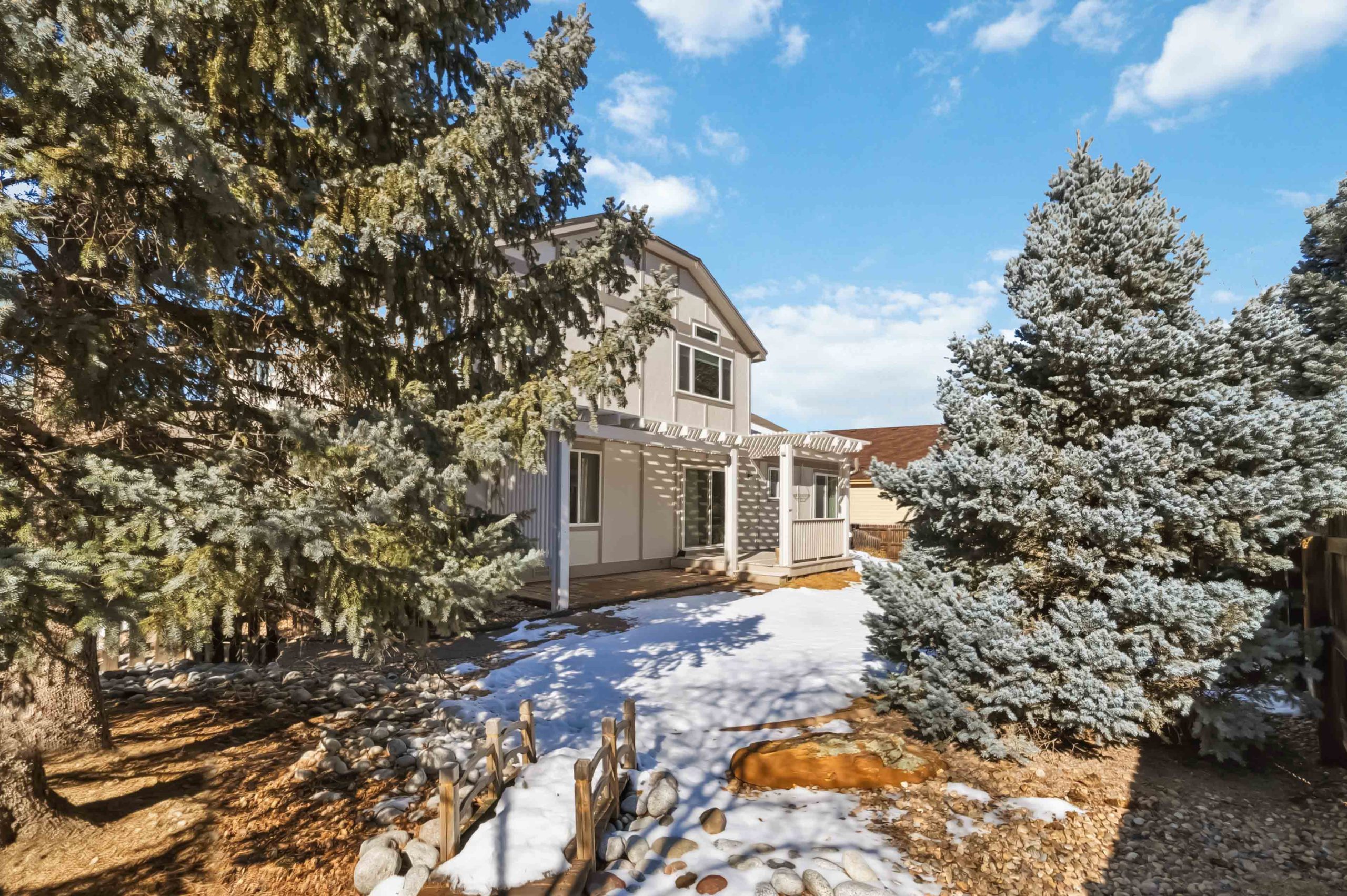 Outside, the backyard delivers ideal Colorado living. A large deck with a substantial pergola steps down to a paver patio, also covered by the pergola. Mature evergreens line the perimeter on multiple sides, and the yard is fully fenced with front and rear sprinklers already in place.